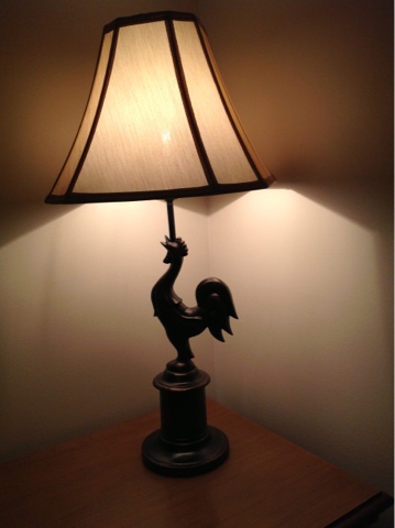 I also seem to be on a rooster theme. I found a lamp that belonged to my mother in law. I have had it for about 9 years and actually had someone " spruce " it up once but I never liked what she did so while I was painting the bathroom hardware I painted the lamp. Much better.